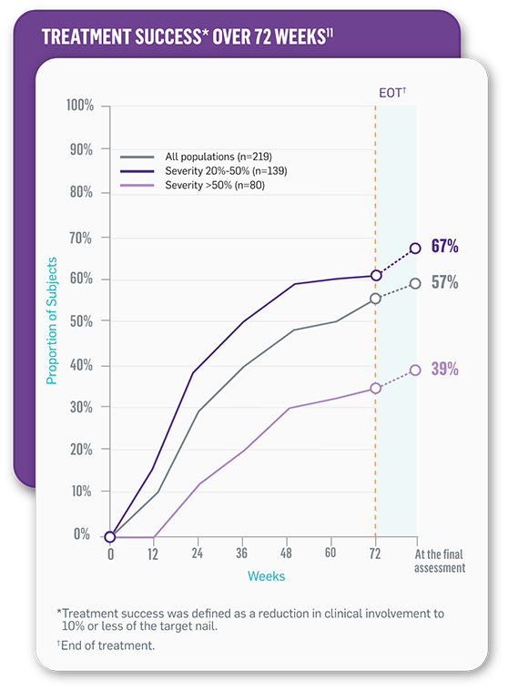 References: 1. Iozumi K, Abe M, Ito Y, et al. Efficacy of long-term treatment with efinaconazole 10% solution in patients with onychomycosis, including severe cases: a multicenter, single-arm study. J Dermatol. 2019;46(8):641-651.