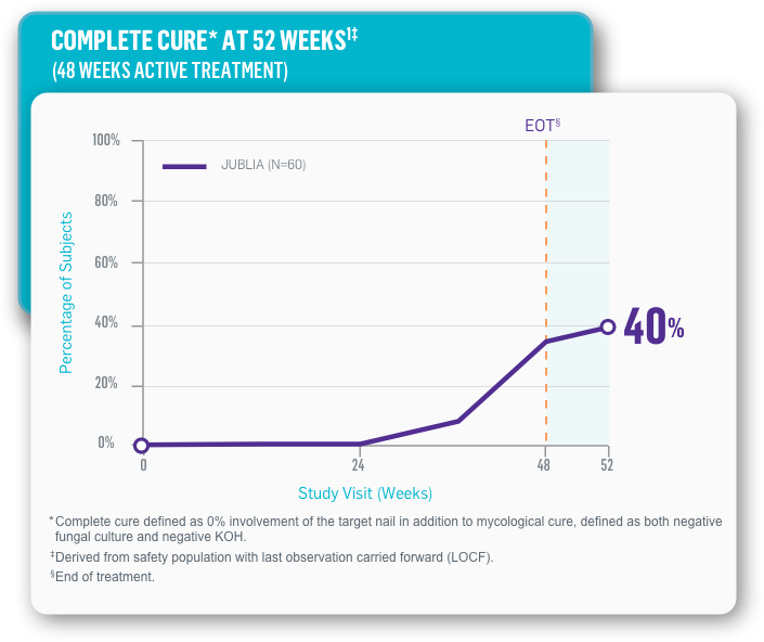 The safety and efficacy of JUBLIA were assessed in a Phase 4 multicenter, open-label, single-arm study of pediatric patients (6-16 years) with at least mild toenail distal lateral subungual onychomycosis (defined as ≥20% clinical involvement of the target toenail, without dermatophytomas or matrix [lunula] involvement) on at least one great toenail (N=60). The pharmacokinetics of JUBLIA were assessed in a subset of patients aged 12-16 years with ≥50% clinical involvement of both great toenails plus onychomycosis in ≥4 additional toenails (n=15).1
